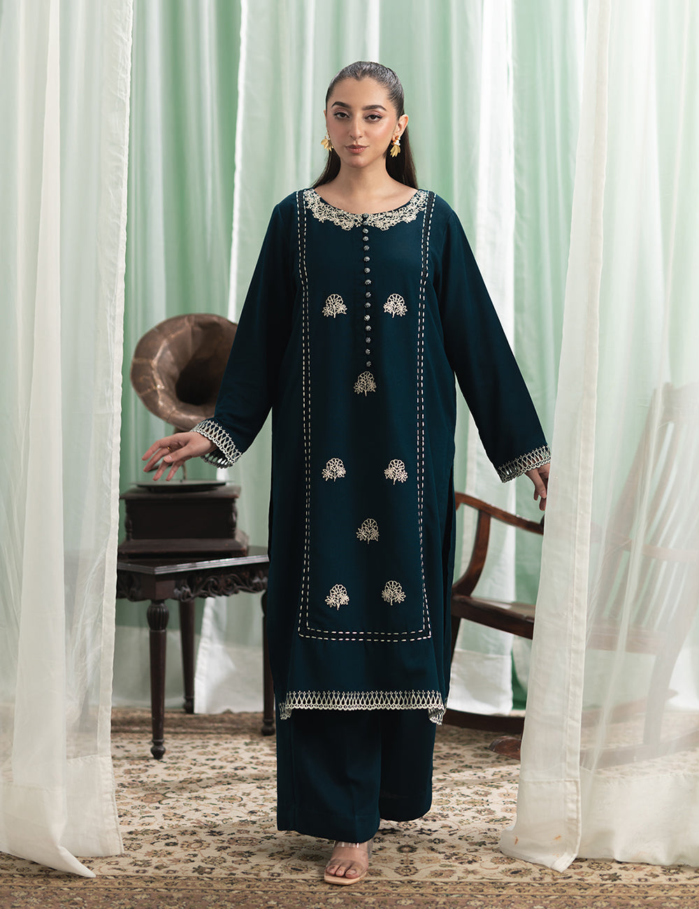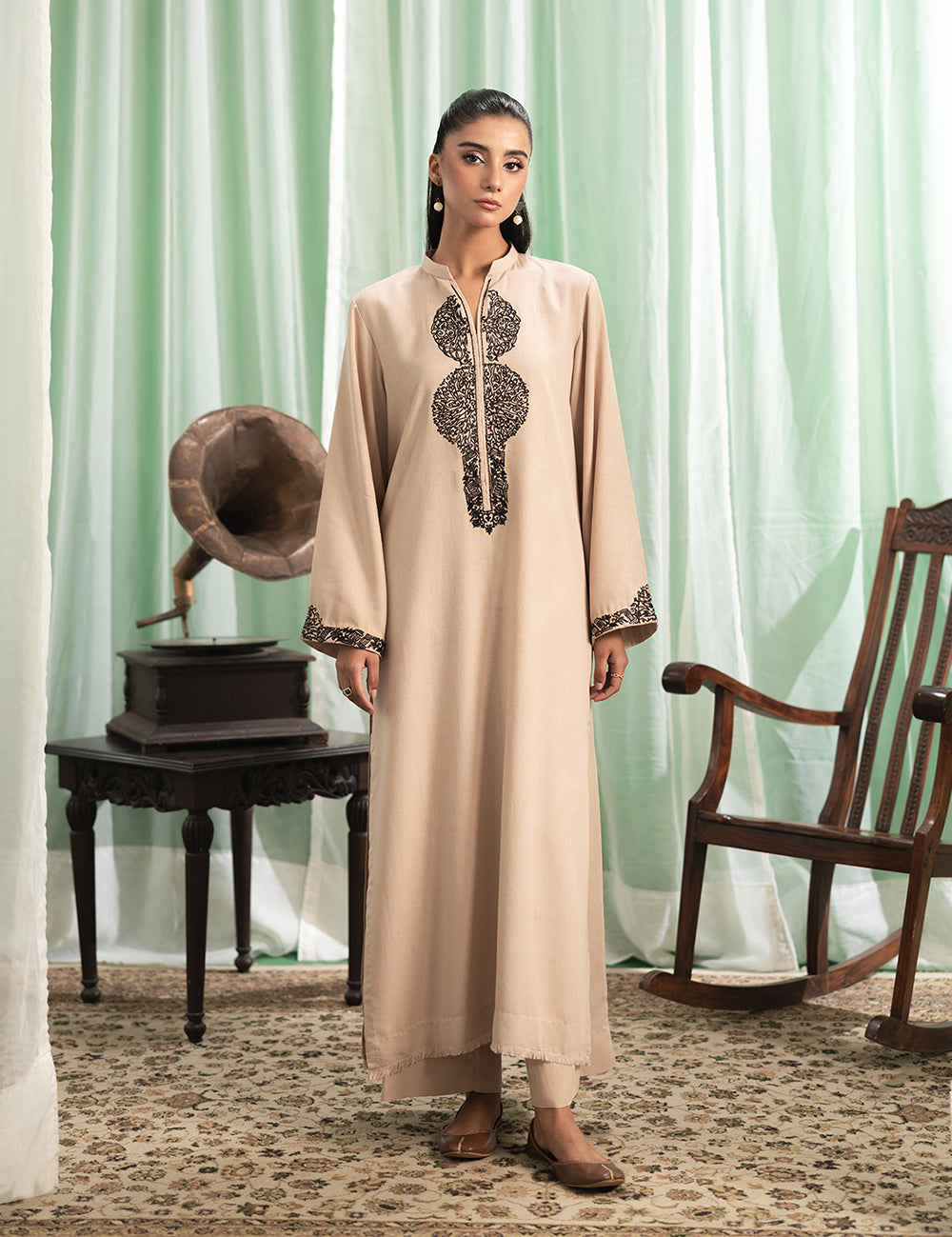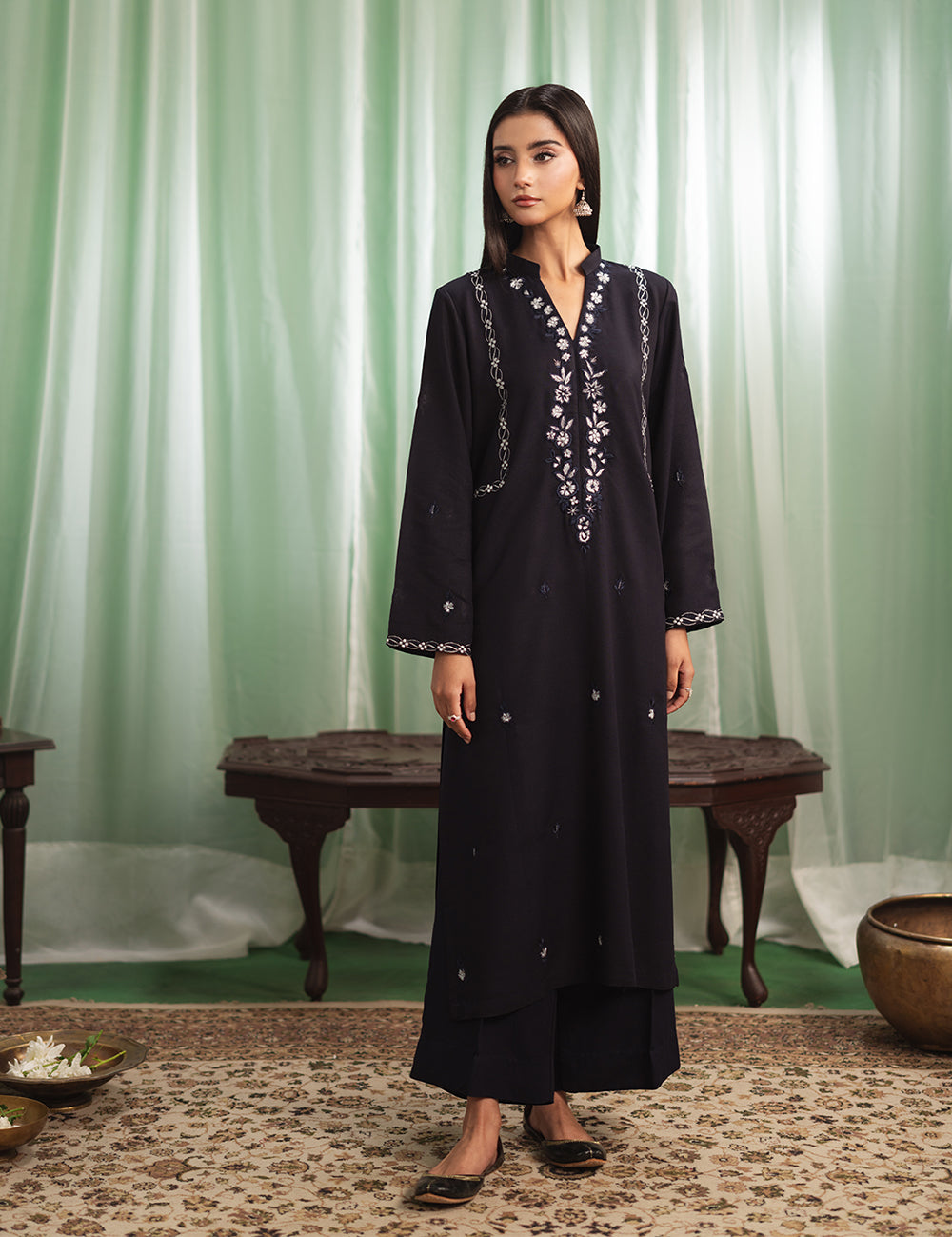 $90.00$90.00/Description: Subtle, yet striking, this karandi set features embroidery that flows like poetry over the beautifully woven fabric, making it a statement piece.Shirt: Karandi Trouser: Karandi