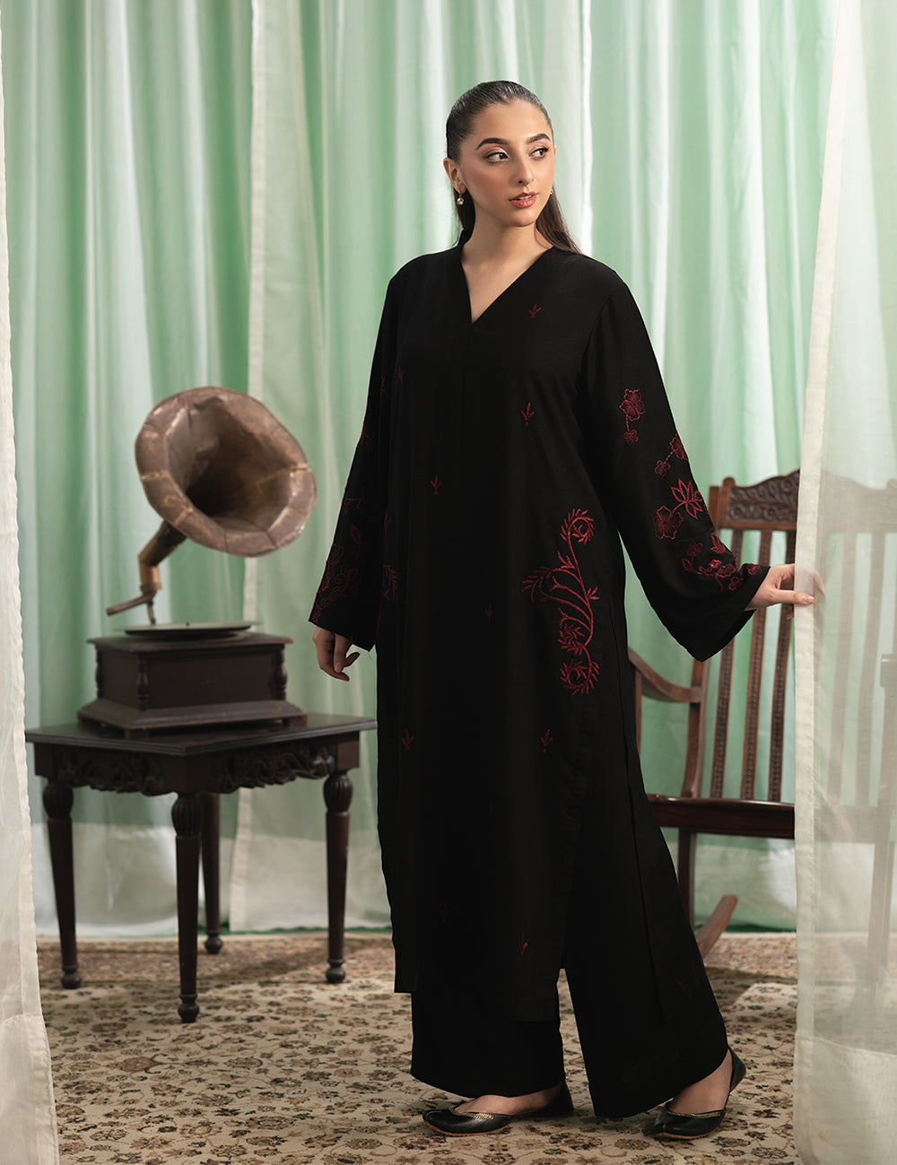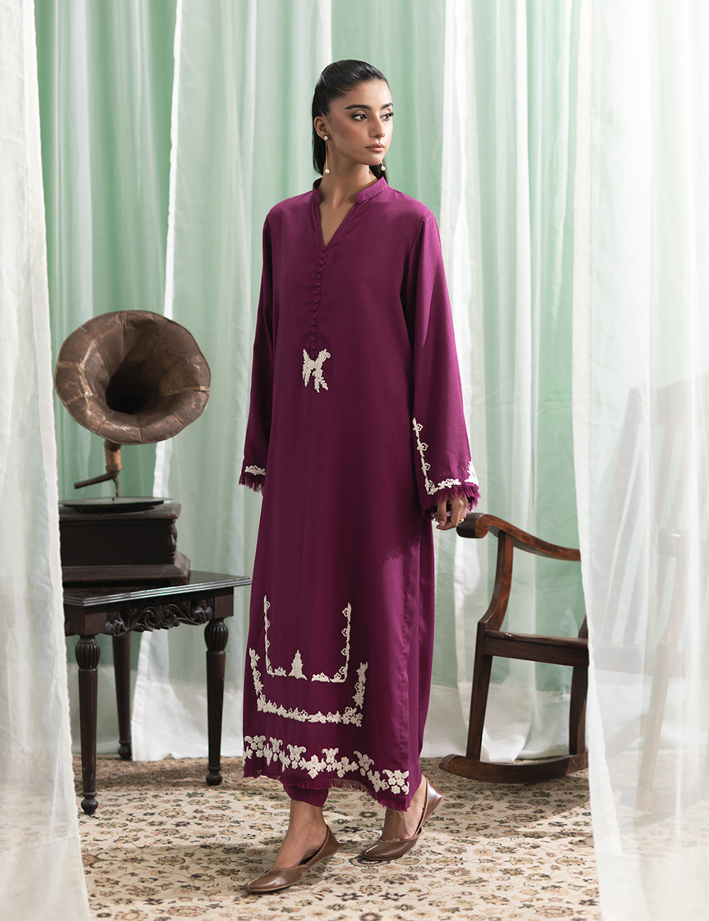 $90.00$90.00/Description: An effortlessly graceful plum silhouette in karandi elevated by fine embroidery, perfect for a girls day out or any formal event.Shirt: Karandi Trouser: Karandi